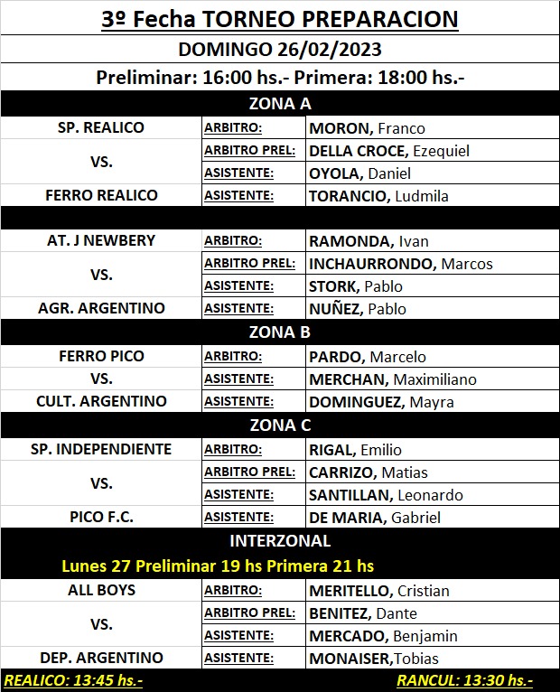 ARBITROS DE LA TERCERA DEL TORNEO PREPARACIÓN 24 de febrero de 2023 CompartirEl fin de semana se disputará la tercera fecha del torneo preparación. Se conocieron los árbitros que impartirán justicia en los cinco partidos. ESTO TE PUEDE INTERESAR:TORNEO EXTRA: SE COMPLETARON LAS FINALES DE IDA EN…VETERANOS: SE JUGÓ LA ÚLTIMA DE LA FASE REGULAR Y SE…HOY SE CUMPLEN 10 AÑOS DEL 38 A 38SI PERMITÍS QUE TE FLEXIBILICEN HOY, TE COMERÁS EL…COPA LIGA PAMPEANA: SE CONOCIERON LOS FINALISTASCOPA LIGA PAMPEANA: SE DISPUTARON LAS FINALES DE IDA…Compartir