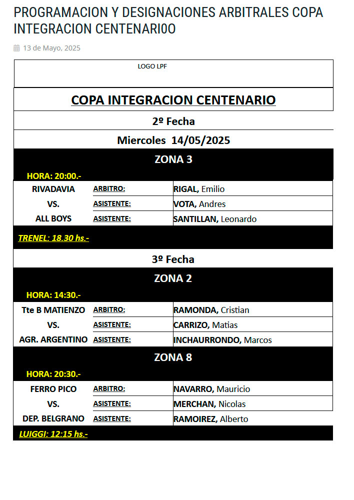 En el día de mañana se juega la Copa Integración con tres partidos, uno por la segunda fecha de la zona 3 entre Rivadvia recibe a All Boys de Trenel, por la zona 2 Matienzo recibe a Agrario y por la zona 8 Ferro de Pico recibe a Belgrano de VIlla Mirasol.
