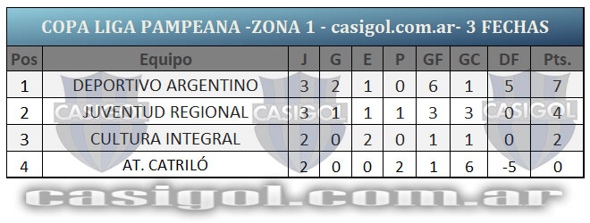 En el arranque de la tercera fecha por la zona 1 Deportivo Argentino derrotó en el clásico a Juventud Regional por dos a cero. Los goles fueron ambos en el primer tiempo. La apertura del marecador llegó por intermedio de Santiago Silvestre a los 10', luego el local se quedó con diez por la expulsión de Bruno Hormaechea y a los 39' Bautista González puso el segundo para los dirididos por el vasco Hormaechea. En la segunda parte Hubo alguna ocasión pero no se modificó el marcador y el "Depo" se hizo fuerte en el Carlos Sierra y se quedó con el clásico y la punta en la zona 1 de la Copa Liga Pampeana "50 años de LU 37". En la próxima fecha el Depo. recibe a Cultura Integral en el "Carlos Sierra" por la primera de la segunda rueda y en el otro partido de la zona el sábado juegan en el "Meridiano V" At. Catriló y Cultura Integral.