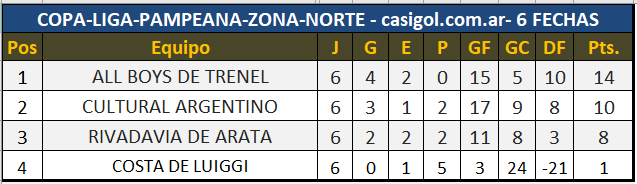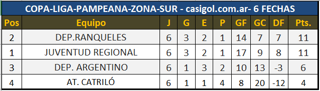 Se disputó la última fecha de la fase regular de la copa Liga Pampeana en la cuál los finalistas son por la zona Norte All Boys de Trenel y por la sur Dep. Ranqueles que igualó en puntos con Juventud Regional pero que porque fue superior en los partidos disputados entre ellos clasificó para la final que dará el 50% del torneo Copa Liga  Pampeana.