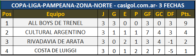 Con un partido se completó la tercera fecha del torneo Copa Liga Pampeana. El encuentro que faltaba se disputó en el 'Semillero Celeste' de Arata, entre el local Rivadavia y Cultural Argentino, por la zona Norte. El resto de los encuentros se habían jugado el jueves y sábado respectivamente.