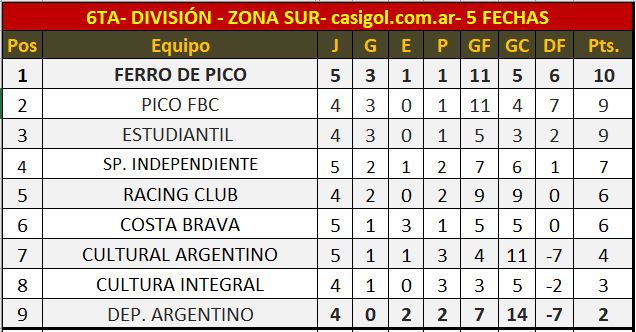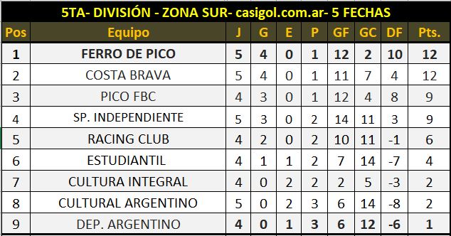 Se disputó la quinta fecha del torneo de fútbol de divisiones inferiores en sus categorías sexta y quinta, para las zonas sur y norte de la temporada 2021 de la especialidad. En el encuentro en el cuál Costa Brava debía disputar su partido con Cultura Integral y este no se presentó por razones particulares según publica la fanpage oficial de Costa Brava. Nosotros por el momento le otorgamos los puntos al club albirrojo en nuestras tablas dando ganador al conjunto de barrio Este por uno a cero. Luego Liga Pampeana resolverá en consecuencia acerca de esos partidos.