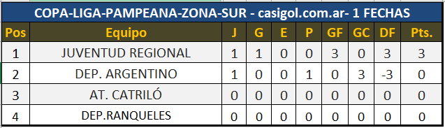 Anoche a las 21:00hs. en el "Carlos Sierra ", por la zona Sur dio comienzo el torneo Copa Liga Pampeana. La misma tuvo su apertura con el partido entre Deportivo Argentino y Juventud Regional. La victoria correspondió al conjunto de Daniel Csercseri por tres a cero con tantos de Diego Delfino, Augusto Bastia y Franco Vázquez. De esta manera el conjunto de Miguel Cané pica en punta en esta zona Sur a la espera de lo que suceda el próximo domingo a las 16:30hs. en nuestra ciudad entre Dep. Ranqueles y At. Catriló .