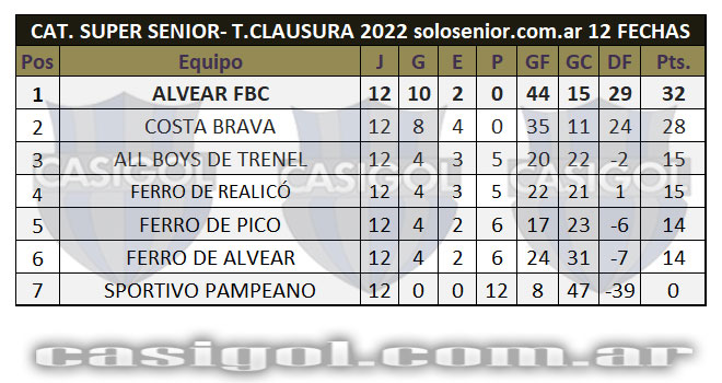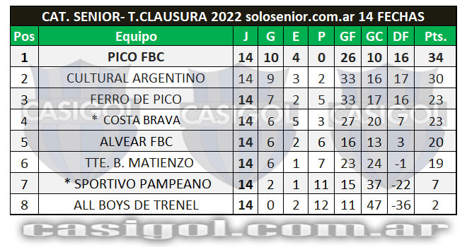 Nota: En el tercer lugar igualaron Ferro de Pico y Costa Brava con 23 puntos, pero es tercero Ferro porque en el partido disputado entre ellos perdió 2 - 3 en la primera rueda y ganó 3 a 1 en la segunda. lo que hace un global de 5 a 4 para Ferro que de esa forma es tercero en la general .