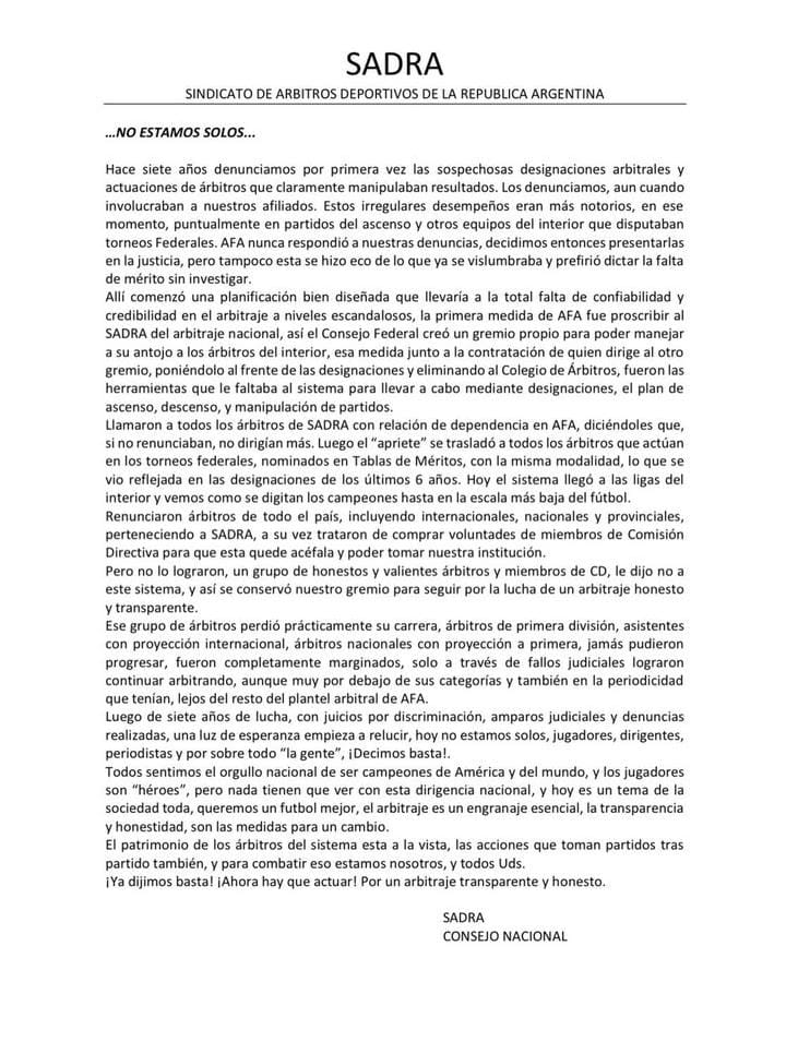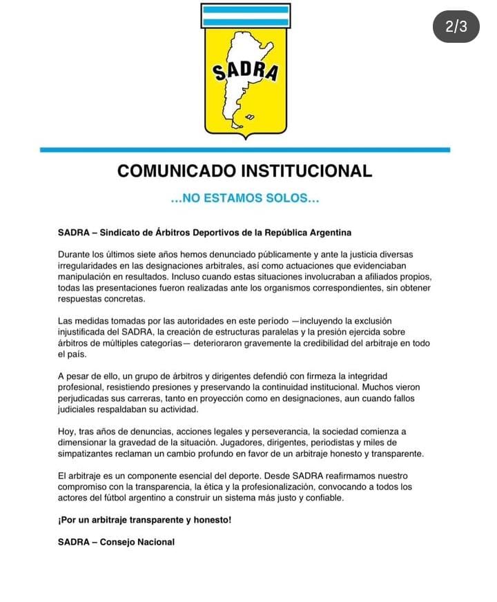 El Sindicato de Árbitros Deportivos de la República Argentina (SADRA), que nuclea a los árbitros del interior, emitió un duro comunicado en el cual denuncia manipulaciones en las designaciones arbitrales, presiones internas y la existencia de un sistema que, según sostienen, incide directamente en ascensos, descensos y resultados deportivos.