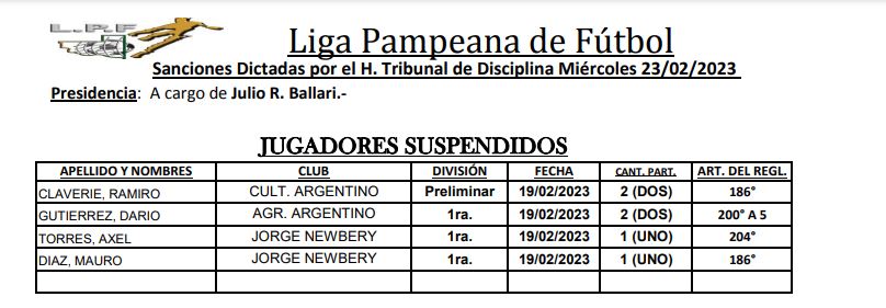 SANCIONADOS DE LA SEGUNDA FECHA DEL TORNEO PREPARACIÓN 24 de febrero de 2023 CompartirLiga Pampeana de fútbol dio a conocer los sancionados de la segunda fecha del torneo preparación. ESTO TE PUEDE INTERESAR:TRFA: LAS TABLAS Y LOS 16 CLASIFICADOS EN LA REGIÓN…JUEGOS DE LA ARAUCANÍA: PLANTELES Y FIXTURE EN…QUE ASÍ LO QUIERA EL DESTINO: FERRO BUSCA PEGAR PRIMEROCOPA LIGA PAMPEANA: SE SORTEARON LAS LOCALÍAS DE LAS FINALESTRFA: CLASIFICÓ FERRO Y EL OPERATIVO RETORNO SIGUE VIVOTRFA: FERRO EMPATÓ EN EL COLOSO Y AHORA TENDRÁ QUE…Compartir