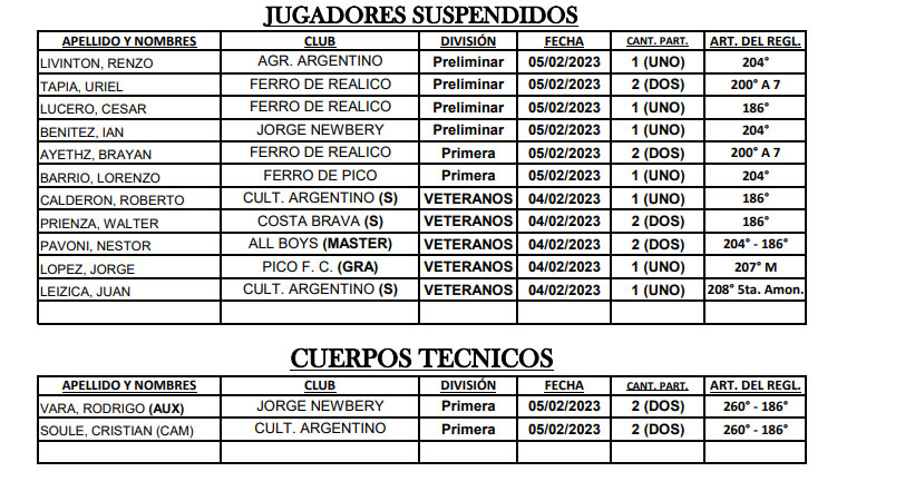 SANCIONES DEL TRIBUNAL DE DISCIPLINAS DE LIGA PAMPEANA DE FÚTBOL