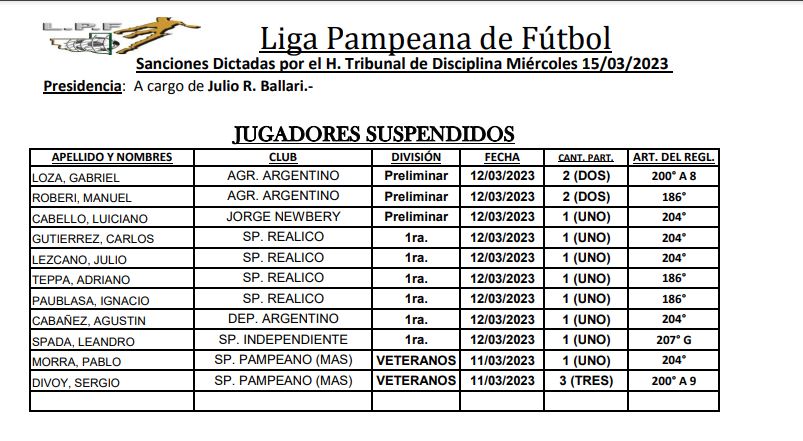 SANCIONES DEL TRIBUNAL DE DISCIPLINAS DE LIGA PAMPEANA DE FÚTBOL 16 de marzo de 2023 CompartirSanciones del tribunal de disciplina de Liga Pampeana, de la quinta fecha del torneo preparación y del último partido del fútbol de veteranos disputado el pasado sábado. ESTO TE PUEDE INTERESAR:ÁRBITROS DE LIGA PAMPEANA PARA LAS FINALES DEL FIN DE SEMANAVETERANOS: WALTER TOMASELLI DIALOGÓ CON NOSOTROS Y…SI PERMITÍS QUE TE FLEXIBILICEN HOY, TE COMERÁS EL…VETERANOS: PROGRAMACIÓN DE LAS SEMIFINALES DEL CLAUSURAJUEGOS DE LA ARAUCANÍA: EN NUESTRA CIUDAD EL ACTO…TRFA: FERRO PASÓ POR PENALES Y SE METIÓ EN LA TERCERA FASECompartir