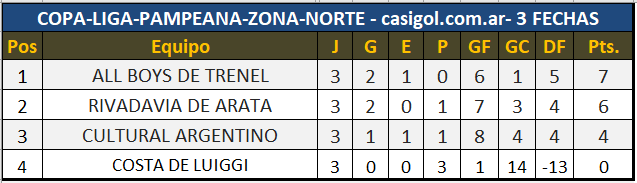 Se completó la tercera fecha del torneo Copa Liga Pampeana de fútbol para las zonas Norte y Sur. Los resultados de los cuatro partidos que se disputaron entre miércoles y jueves fueron los siguientes.