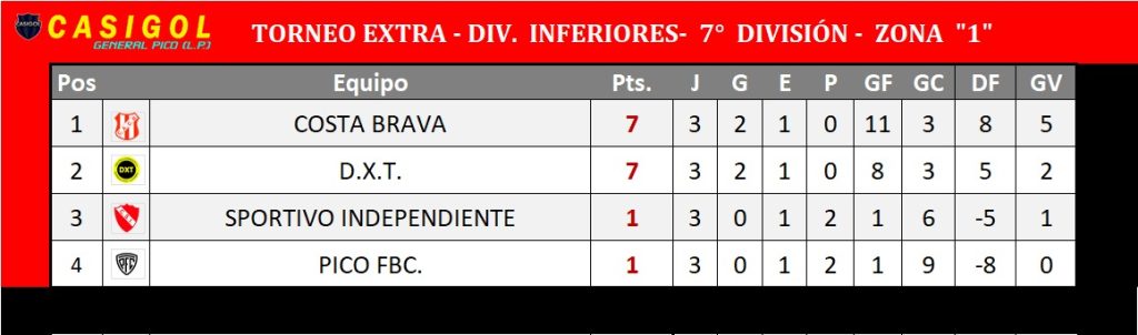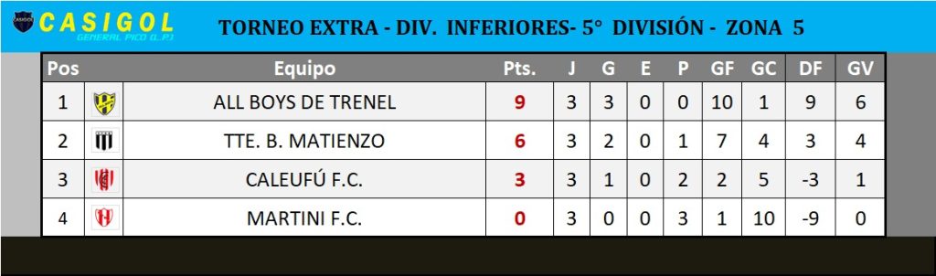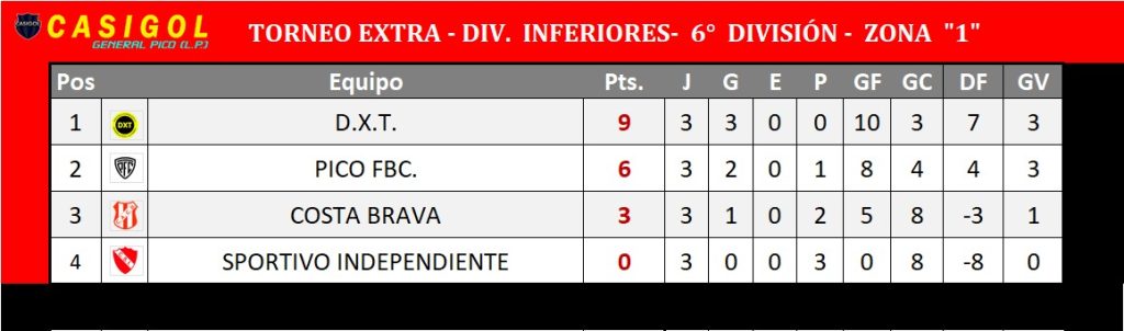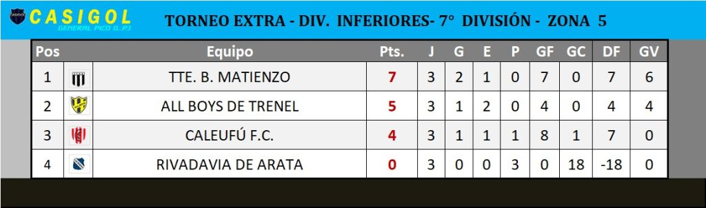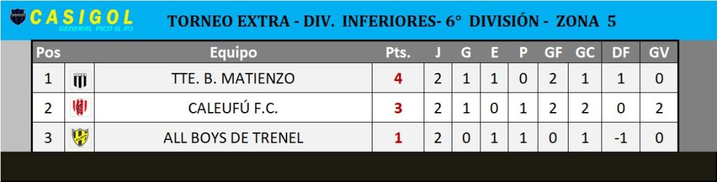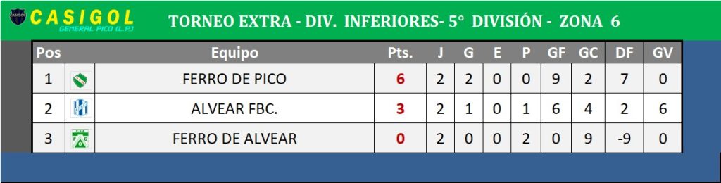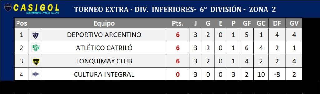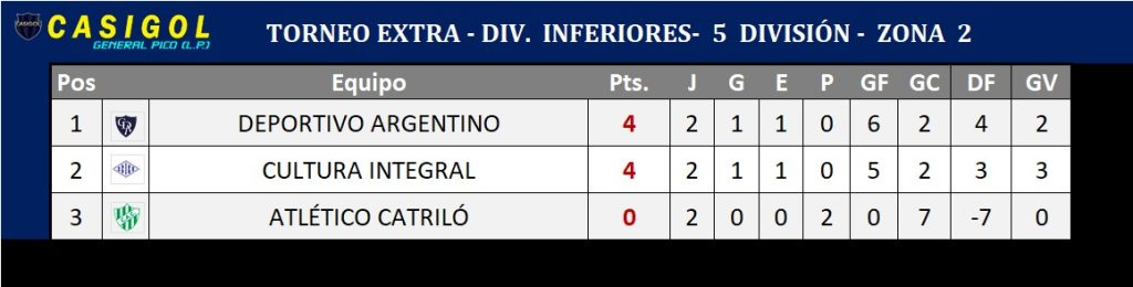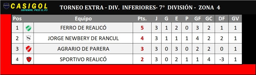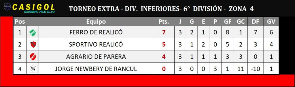 En la noche de hoy, y tras una ensalada de días y horarios, se completó la tercera fecha del torneo extra de divisiones inferiores para las tres categorías que la componen y en sus seis zonas. Recordamos que todo había comenzado el jueves con los encuentros entre Cultural Argentino y Estudiantil, continuó el viernes y finalizó el sábado cerca de la medianoche con los partidos entre Ferro de Realicó y Agrario de Parera.