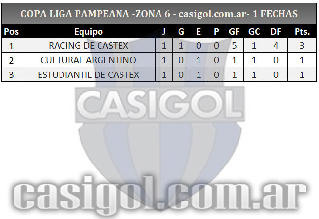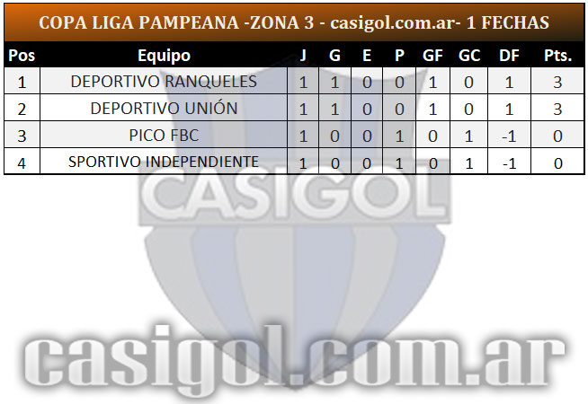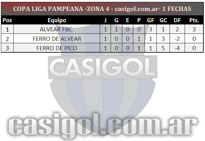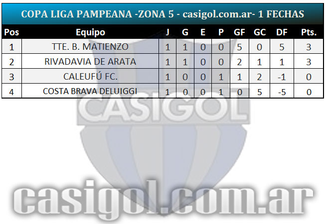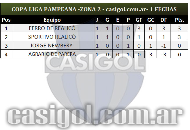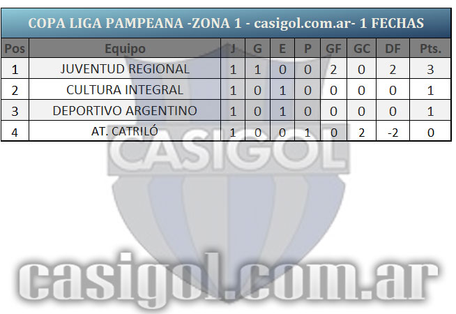 Se disputó la primera fecha del torneo Copa Liga Pampeana, "50 años de Radio 37" en sus seis zonas que lo componen. La síntesis de lo sucedido es la siguiente: