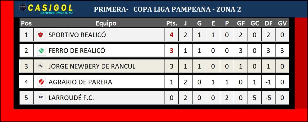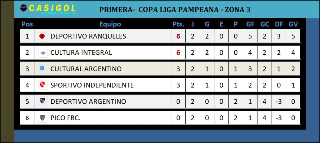 Hoy se completó la segunda fecha del torneo de Copa Liga Pampeana en sus tres zonas. La jornada había comenzado con dos de los tres encuentros de la zona C, donde Deporitvo Argentino cayó ante Deportivo Ranqueles en el "Carlos Sierra" y se disputó el clásico entre Pico FBC. y Sportivo Independiente en el "Emiliano Luis Cayre", con el triunfo rojo.