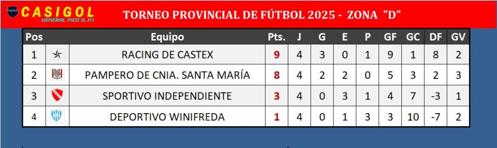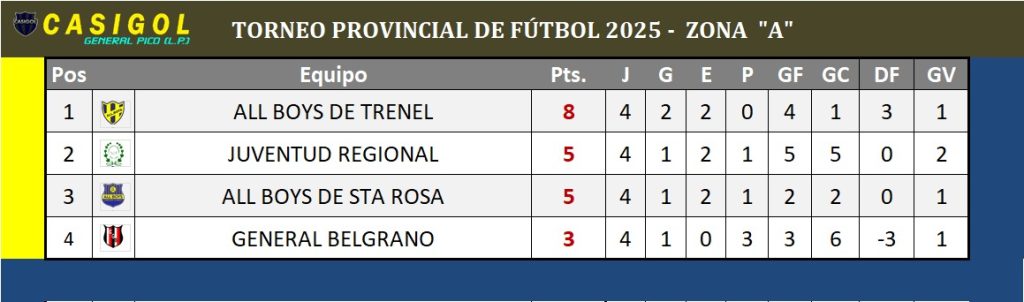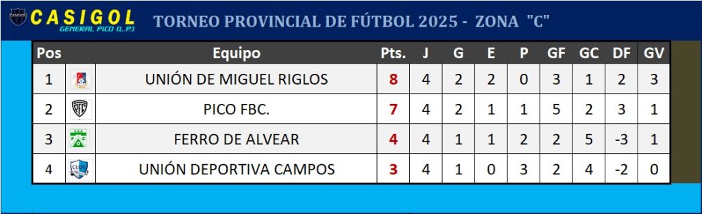 En el día de hoy se completó la cuarta fecha del torneo provincial de fútbol en las cuatro zonas que lo componen. Recordamos que en el día de ayer se jugó la zona "B" con el triunfo de Alvear FBC y el empate de Costa Brava en Santa Rosa ante Atlético.