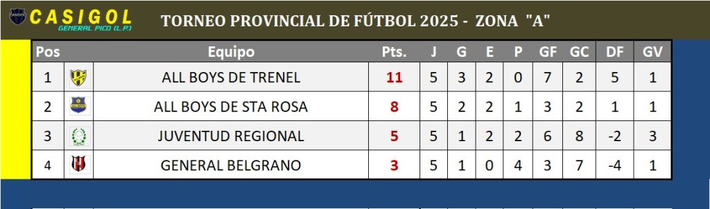 En la tarde de hoy se completó la quinta fecha del torneo provincial de fútbol "Alberto Mario Jorge"  donde en las cuatros zonas hay final cerrado, con algunas eliminaciones otros clasificados, pero con mucho por resolverse aún.