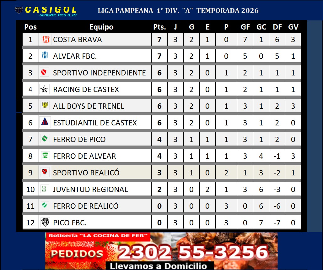 En el día de hoy se completó la tercera fecha de la Liga Pampeana de fútbol, con cuatro partidos disputados en dos horarios diferentes. Los dos encuentros restantes ya se habían jugado de manera adelantada: en Miguel Cané, Juventud Regional y Ferro de Alvear igualaron 2 a 2, mientras que Costa Brava derrotó 4 a 0 a Ferro de Realicó.