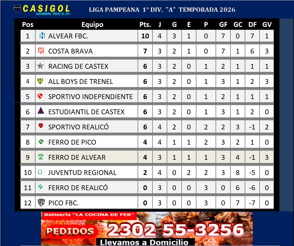 Recordamos que, por la tarde, Alvear FBC, líder con 10 puntos, derrotó a Juventud Regional por dos a cero, con goles de Tosselli y Pérez.