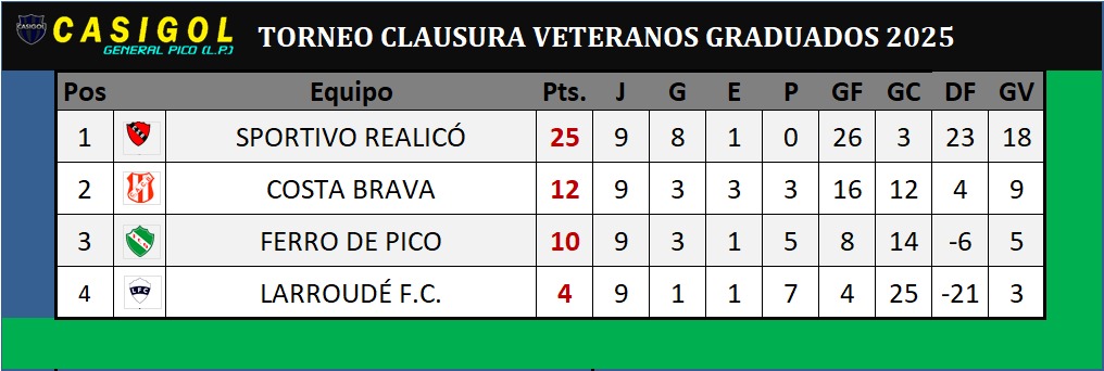 En la tarde de hoy se disputó la última fecha del torneo clausura de fútbol para veteranos, donde en categoría graduados se enfrentaron en primer turno Sportivo Realicó y Costa Brava con el resultado de empate en un tanto por lado.